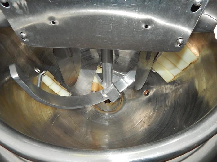 1 - used 20 gallon Hamilton Single Motion Scrape Kettle. Model SA-20. With all stainless steel sanitary construction, food grade polished finish. Fully jacketed body is National Board (#5188) rated for 40 psi @ 267 deg. F. Factory hydro tested @ 67 psi. Bridge mounted single motion anchor style agitator with nylon scraper blades and bottom paddles. 4.3/2.1 amps, 60 cycle, motor is UL rated for hazardous locations under class I group D. Manually adjustable agitator speeds from 14 to 56 RPM. Bridge has (2) 5" x 9" long spade shaped baffles with adjustable angles. 2" center bottom outlet, flush seating manually operated ball valve. Tri-clamp connection and 19" floor clearance. Portable clamp mount mixer stand on brim of vessel. One loose fitting cover. Formerly used in food ingredients manufacturing. F.O.B. - LOCATION