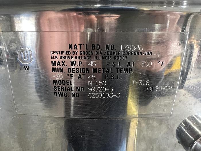 1 - used 150 gallon Groen Kettle, S/N 99720-3, built 1993. Rated 45 psi @ 300 deg F max W.P. Min. design metal temp. -20 deg. F @ 45 psi. T-316 stainless steel construction. National Board code stamped #138946-1. Drawing #C253133-3.